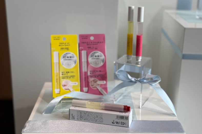 ピンク色の「PC リッチショット」は目元や額など、ピンポイントでハリ感を出したいところに。